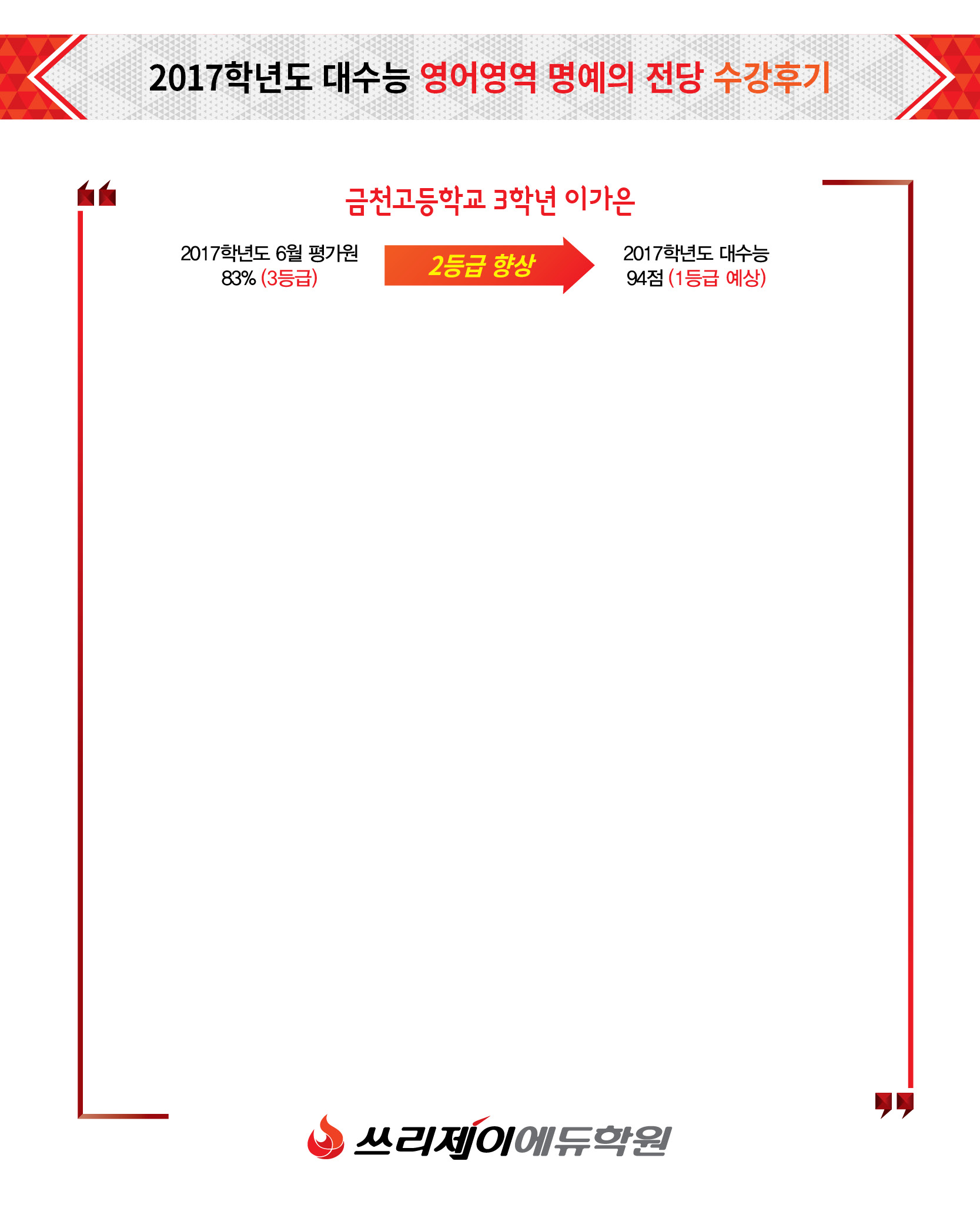 저는 올해 고3 2월(고2 겨울방학 끝날 때 쯤?)부터 쓰리제이에듀를 다니게 됐어요! 평소 모의고사에서 2등급은 나왔지만 못 볼 때는 3등급 하위권도 나오기도 했던 되게 불안정적인 2등급 이였어요.ㅠㅠ 그 전까지 영어학원 두 군데를 거치며 일 년을 넘게 배우면서 버텼었지만, 예체능인 미술을 하는 저에게 수업시간을 학원이 맞춰주지도 않았고 그 수업이 제가 부족한 부분을 채워주는 것 같지도 않았어요. 그런데 혼자하기엔 정말 너무 영어 실력에서 빈곳이 많은 것 같아서 학교 앞에서 나눠주는 공책도 보고 친구의 추천을 받아 쓰제에서 배우기로 결정을 했어요! 다른 학원들은 공책이나 전단지에서 광고하는 거랑 다른 점들이 많은데 쓰제는 정말 공책이랑 다른 것 없이 체계적으로 커리큘럼이 짜여있었고 존쌤과 학원쌤들께서 철저하게 그걸 관리해서 학원 다니면서 계속 찾아왔던 학원이라고 생각했어요! 처음 레벨테스트를 볼 때 생각했던 것 보다 점수가 낮게 나와서 그때부터 진짜 내가 많이 부족하구나 라는 생각도 했었고 그것 때문에 더 현실직시를 하고 열심히 할 수 있었던 것 같아요! 저는 신택스를 인터 단계만 듣고 어드는 못듣고 바로 ebs로 들어갔는데 신택스를 배우면서 정말 일찍 왔어야 했다고 계속 후회했어요.ㅠㅠ 신택스 어드를 들었으면 빈칸도 더 잘 추론 할 수 있을 것 같았고 문맥 파악에도 도움이 될 것 같았어요. 그런데 처음에 슬기쌤이랑 상담 할 때 슬기쌤께서 인터만 제대로 해도 1등급 나올 수 있다고 하시는 말씀을 생각하면서 공부했어요 ㅎㅎ 그런데 이렇게 잘 하다가도 제가 게을러져서 공부를 덜 하게 되고 그래서 학원에서 수업경고도 받은 적이 있었어요 ㅜㅜ 그땐 모의고사 점수가 올라가지 않고 오히려 3등급으로 떨어져서 그럴 때마다 정말 내가 잘하고 있는지, 잘 따라가는건지 잡다한 생각이 많이 들었어요. 근데 정말 그런 시점에 존쌤이 강의에서 저같이 생각하는 친구들이 있을텐데 믿고 따라오면 오를 수 있다고 확신하시면서 말씀해주셔서 그냥 계속 꿋꿋이 공부했던것 같아요. 그리고 그런 시점에서 슬기쌤께서 작년 쓰제 학생 중 제가 원하는 대학교에 입학한 선배님이 쓰신 공부에 대해서 쓴 것을 프린트 해주셨는데 그게 멘탈 잡는데 정말 많이 도움이 된 것 같아요.ㅜㅜ 거기서 선생님이 정해주시는 공부의 양은 정말 최소한으로 잡아주는 거라고 쓰여져 있는데 그걸 보면서 최소한도 못하는데 어떻게 더 나아갈수 있겠냐는 생각이 들어서 그때부터 다시 열심히 할 수 있었어요! 그리고 ebs강의를 들으면서 그 스킬에 맞게 문제풀이를 해주시는데 저는 수특을 들을 땐 스킬이나 티엘알 적용하는 것에 익숙하지 않아서 수특 보다 수완 강의에서 정말 많은 도움을 얻었어요! 수완 강의 들을 땐 진짜 명쾌하게 풀렸고, 강의 하나씩 들을 때마다 더 많이 알아가는 느낌이 정말 많이 들었어요. 그런데 이렇게 알아도 시간이 지나면 다시 까먹을 수가 있는데, 일주일에 한번 담임쌤께서 문제풀이 스킬을 적용하시면서 테스트를 보니까 그때 더 확실히 알 수 있었고 정말 선생님이 테스트 해주시는게 중요한 역할을 하는 것 같아요 ㅠㅠㅠ 진짜 백프로!! ㅠㅠ 9평 때는 그전수업에 테스트 봤던 내용이 직접연계 빈칸으로 나와서 바로 알아 봤어요. ㅜㅜ ebs피티도 선생님이 테스트를 진짜 잘해주셔서 아니 정말 중요한 지문을 어떻게 고르시는지 모르겠는데 테스트를 본게 거의 모의고사들에서 많이 느껴졌어요.. ㅠㅠ ebs피티를 많이 반복하니까 확실히 다른 친구들보다 연계율을 많이 느낄 수 있었고 이번 수능이 어렵긴 했지만 요약문은 저는 바로 요약문만 보고 ebs내용이네 하고 지문도 안읽고 답 체크 했어요!! 혹시 다른 내용일지 모르니까 밑에서 한두줄만 올라가서 가볍게 읽고 넘어 갔어요! 저는 학원을 다니면서 국어 사탐도 이런 학원이 있었으면 좋겠다고 항상 생각했어요 그리고 제가 9평에서 국어를 너무 못 봐서 4등급이 나왔었고 그 전에도 3등급 위를 올라간 적이 없었어서 슬기쌤께 국어를 어떻게 해야 될지 모르겠다고 찡찡댔는데 과목별 상담을 해주시면서 존쌤이 추천해주신 국어 인강을 바로 들었는데 수능 전까지 그 인강 들으면서 모의고사도 꾸준히 풀고 그래서 수능때 국어도 많이 올랐어요! 정말 다른과목도 추천해 주셔서 진짜 감사했어요. ㅠㅠ 마지막으로 최파 모의고사 10회를 풀면서 정말 실전처럼 연습해서인지 시험지 구성과 듣기 반주도 똑같아서 실제 수능장에서 시험볼 때 익숙하다고 생각했어요. 최파는 정말 신의 한수에요♥ ㅠㅠ 이렇게 담임쌤께서 하나하나 다 신경써주시고 수능 끝나고 전화로 같이 기뻐해주셔서 진짜 감사했어요. ㅠ 쓰제 다니면서 영어 문제를 불확실하게 생각만 해서 푸는게 아니라 정확한 근거를 찾아가며 풀수 있게되서 실력이 진짜로 많이 늘었고 결과적으로 수능 점수도 잘나와서 진짜 감사해요. 커리큘럼이 진짜 잘 짜여있고 매년 수능경향에 맞춰서 새로 짜여지는것 같아서 정말 대박이에요 ! 존쌤, 감사하고 잘배우고 1등급 받을 수 있도록 도와주셔서 감사합니다! 쓰제짱...♥
