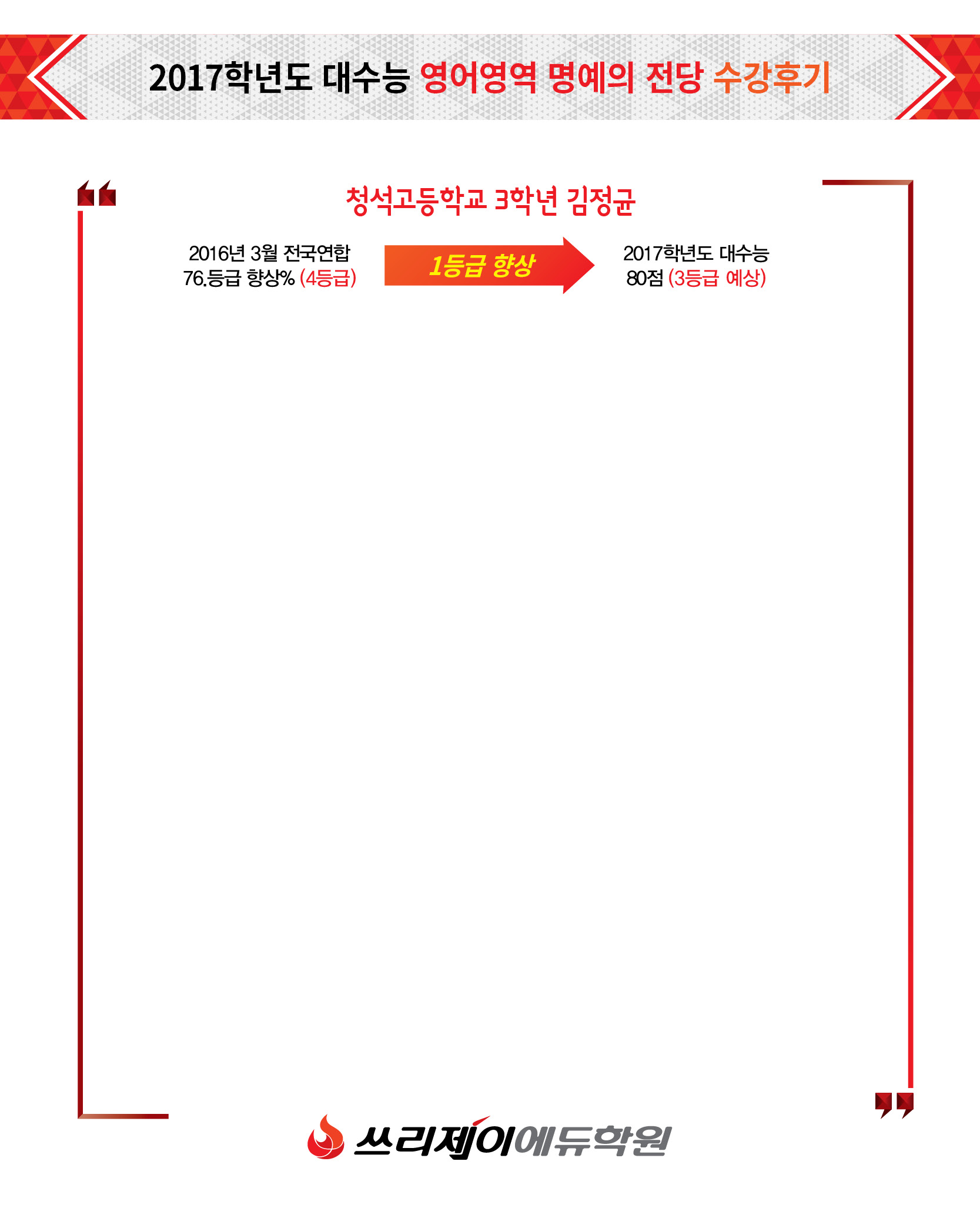 안녕하세요. 저는 이번 2017학년도 수능을 마친 김ㅇ균이라고 합니다. 저는 작년 12월부터 쓰리제이에듀에 다녔어요. 작년, 기말고사를 마치고 고3의 겨울방학을 준비할때였죠. 그때쯤 많은 예비고3학생들은 많은 걱정거리와 고민들로부터 해답을 찾기 시작합니다. 어떤 인강을 들을지, 무슨 책을 사서 공부해야 될지 등의 많은 고민들이 생깁니다. 저도 공부를 어떻게 준비해야하고 앞으로 어떻게 한해를 보내야할까 등 고민이 많았습니다.특히, "영어는 어떻게 공부해야할까?"라는 생각이 가장 컸던 것 같아요. 당시 저의 영어등급은 4등급정도였고, 영어문제를 푸는 스킬이라든가, 시간조절 등 많은 방법과 기초를 몰랐습니다. 당시 저는 실전감각이 없어서 실전감각만 올리면 될 수 있을 것 같다고 혼자서 진단을 내렸어요. 그래서 무작정 매 주 모의고사를 보는 학원을 찾던 중에 쓰리제이에듀 학원을 찾았고, 그리하여 학원을 약 1년정도를 다니게 되었습니다. 후에 레벨테스트를 보고 상담을 통해서, 저는 시간조절 뿐만 아니라 단어, 문장구조 등 많은 것을 몰랐던 반 무지에 가까운 상태라는 것을 알게되었죠. 사실 모든 학원은 아닐지라도, 대부분에 학원은 분위기는 공부할 분위기가 제대로 형성되어있지 않을거에요. 일단, 단과학원이든 종합학원이든 과외가 아닌 이상 친구들이 많이 다니기 때문에 수업시간에 떠들거나 딴길로 빠지기 쉽고, 주변에 친구가 공부를 안하면 너도나도 다 공부에서 손을 놓기 십상일거에요. 하지만, 쓰리제이에듀는 인강, 단어 등의 일주일치 공부할 분량을 혼자서 공부해야하기 때문에 위처럼 타학원등과같은 분위기 때문에 방해받은 일이 없어서 좋았습니다. 또한 일주일동안 공부한 것을 일주일에 한번 단어와 듣기테스트를 비롯해 담당 선생님과 일대일 구문테스트를 통하여 무엇이 부족한지, 자기가 잘 나아가고 행동하고 있는지 등 자가점검을 받을 수 있어서 좋았구요. 또 가기 싫으면 핑계를 대고 하루쯤은 나가지 않아도 되는 타학원에 비해 쓰리제이에듀에서는 이러한 나태함과 게으름, 포기할까하는 흔들리는 수험생을 콱 잡아주어서 표면적인 측면에서는 독하고 빡센 것 같이 보이고 너무하다는 생각이 들지만, 나중에서야 이러한 빡세고 엄격한 규율이 감사한지 알게됩니다. 정말 학원 분위기가 공부하기에 가장 적합하고 최상입니다. 자습하기에도 방해가 되지않구요. 무엇보다도 원장선생님, 부원장선생님들을 비롯해 실장님부터 조교선생님까지 모두 수험생 못지않게 열정적이신게 대박입니다. 매일 밤늦게 마지막 학생의 수업이 끝나기 전까지 최선을 다하는 모습을 보면 정확하게 무엇을 느꼈다 라고 이야기 할 수 없지만, 본 받고 싶고 저렇게 살아야겠다고 생각했으니까요. 학원에 다니면서 영어 과목뿐만 아니라 타과목도 공부하면서 매일을 열심히 살았습니다. 학원을 다니며 열심히 공부하는 학생들을 보며, 전의를 다지기도 했습니다. 1년동안 쓰리제이에듀를 다니면서 얻은 가장 큰 것이 있다면 최선을 다해 사는 법, 인생을 살아가는 방법을 배웠습니다. 감사합니다.